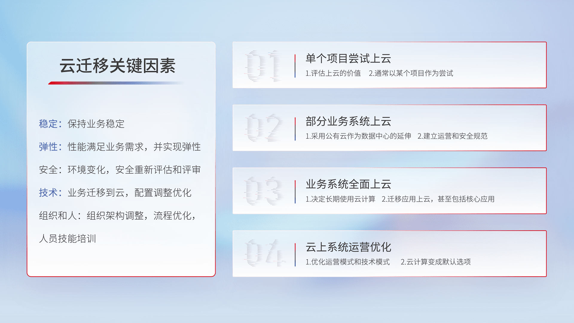 结合实际业务,,,,从规划设计、、、云平台选型、、、云原生改造、、数据迁移、、、、集成交付,,,,迁移全过程为客户识别最佳上云路径,,做好风险识别管理,,,,设计网络架构、、、身份权限、、、安全审计合规、、、、操作审计、、、、日志审计、、、监控告警策略、、、、多站点容灾设计等,,,,对云上基础设施进行整体规划,,,提升IT治理水平,,,,以满足弹性、、、高可用、、高性能的需求。。