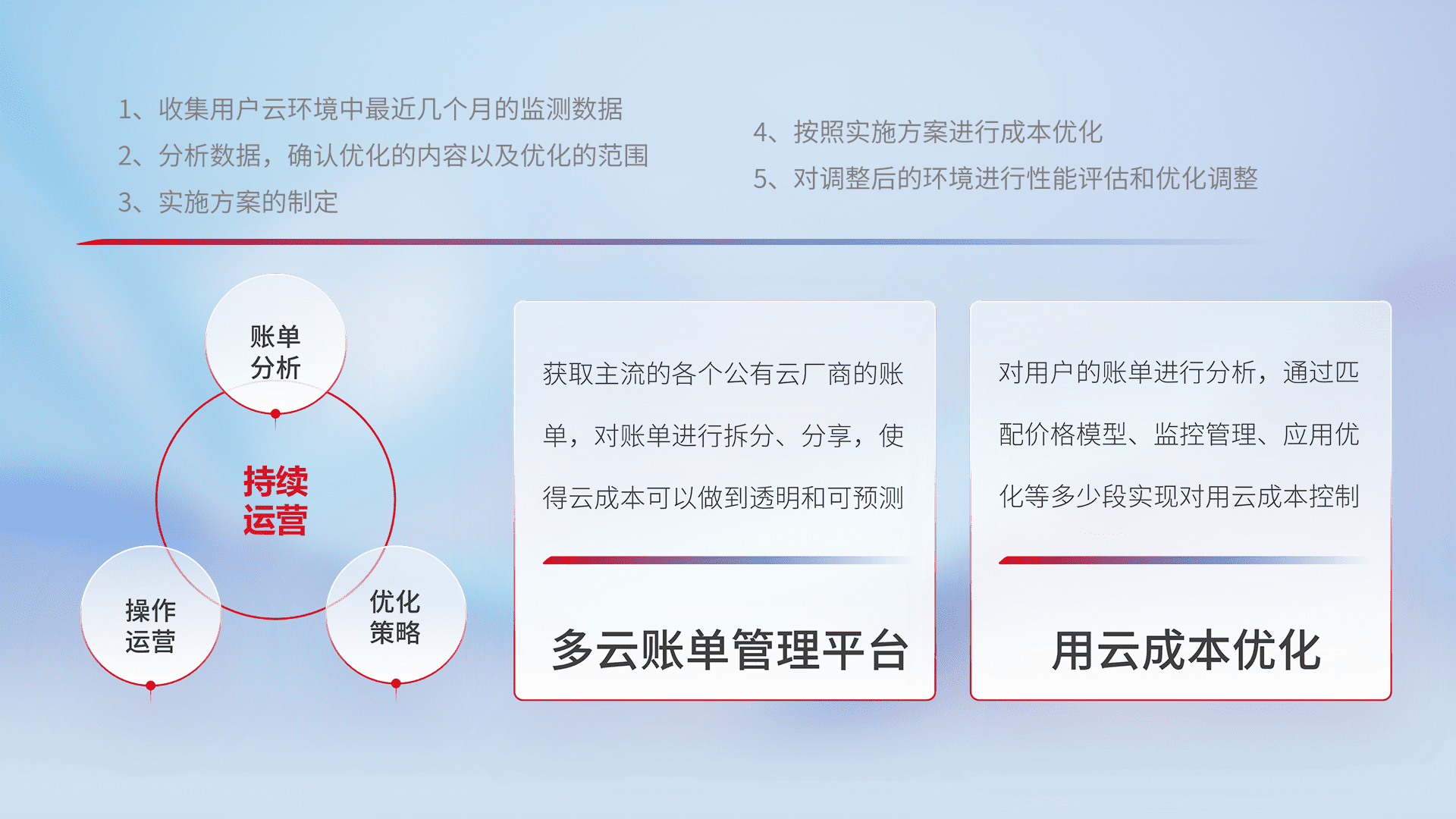 通过多云纳管,,以统一的资源数据模型把客户的云资源进行抽象和封装,,,进而实现对多云资源的统一操作,,保障云资源管理的可靠性、、稳定性与可用性。。量身定制化运维内容,,,配置、、、开发运维、、、、补丁管理、、、备份、、监控、、、、认证和访问管理、、审计和日常巡检等,,,,保障在用云过程中的可靠度,,,稳定度以及高可用率。。。。